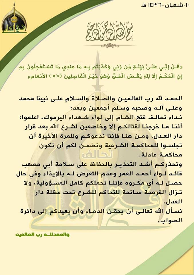 نداء من تحالف فتح الشام إلى لواء شهداء اليرموك والدعوة للجلوس لمحكمة شرعية