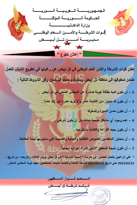بيان من قيادة شرطة تل أبيض تعلن فيه عن حاجتها لتطويع عدد من الشبان في صفوفها في منطقة تل أبيض وسلوك وحمام تركمان