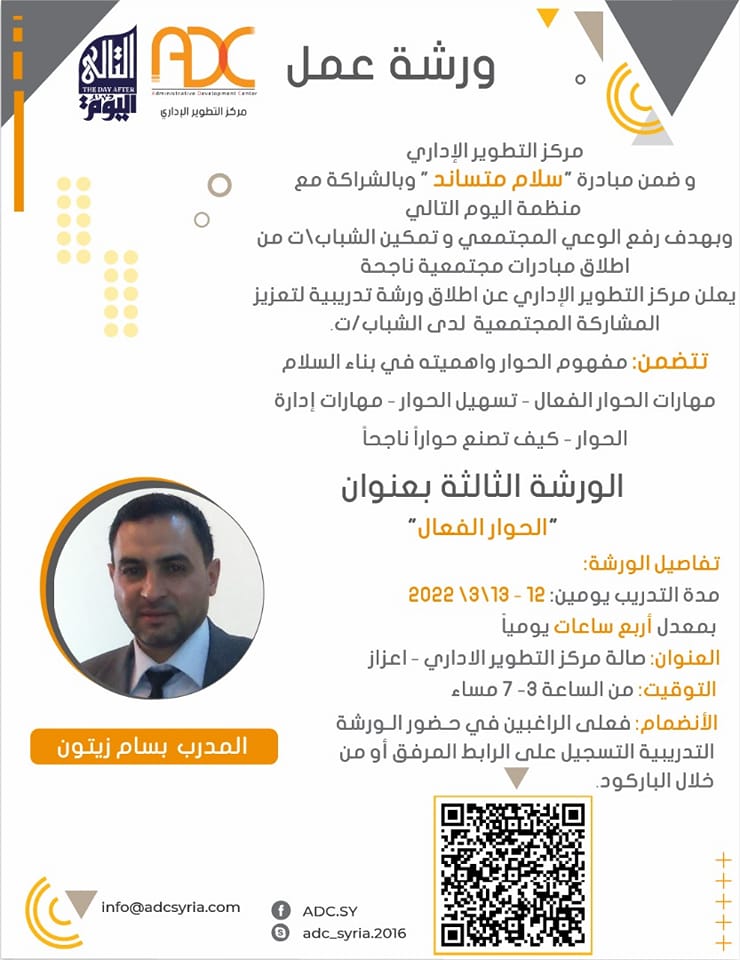 إعلان من مركز التطوير الإداري عن إطلاق ورشات عمل لتعزيز المشاركة المجتمعية لدى الشباب/ت الورِشة التدريبية الثالثة بعنوان: " الحوار الفعال "