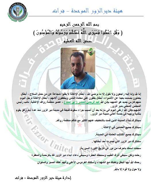 بيان من هيئة دير الزور الموحدة-فُرات تعزي فيه بعضو مؤسسة روافد ونائب رئيس المجلس المحلي في دير الزور