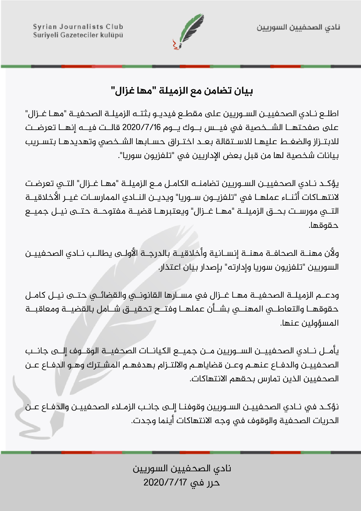 بيان من نادي الصحفيين السوريين يعلن فيه تضامنه مع الصحفية مها غزال العاملة في تلفزيون سوريا