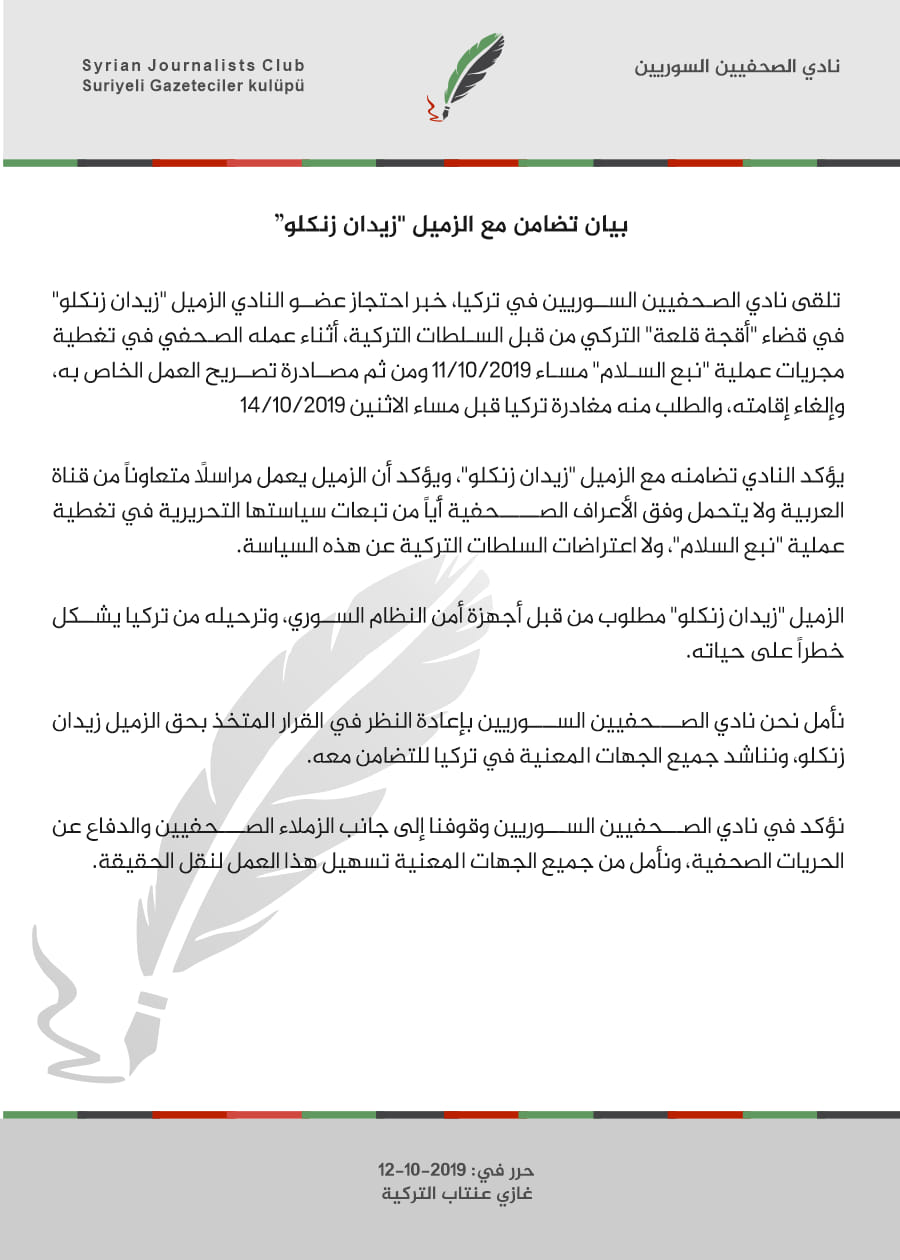 بيان من بيان من نادي الصحفيين السوريين يعلن فيه تضامنه مع الزميل زيدان زنكلو بعد احتجازه من قبل السلطات التركية