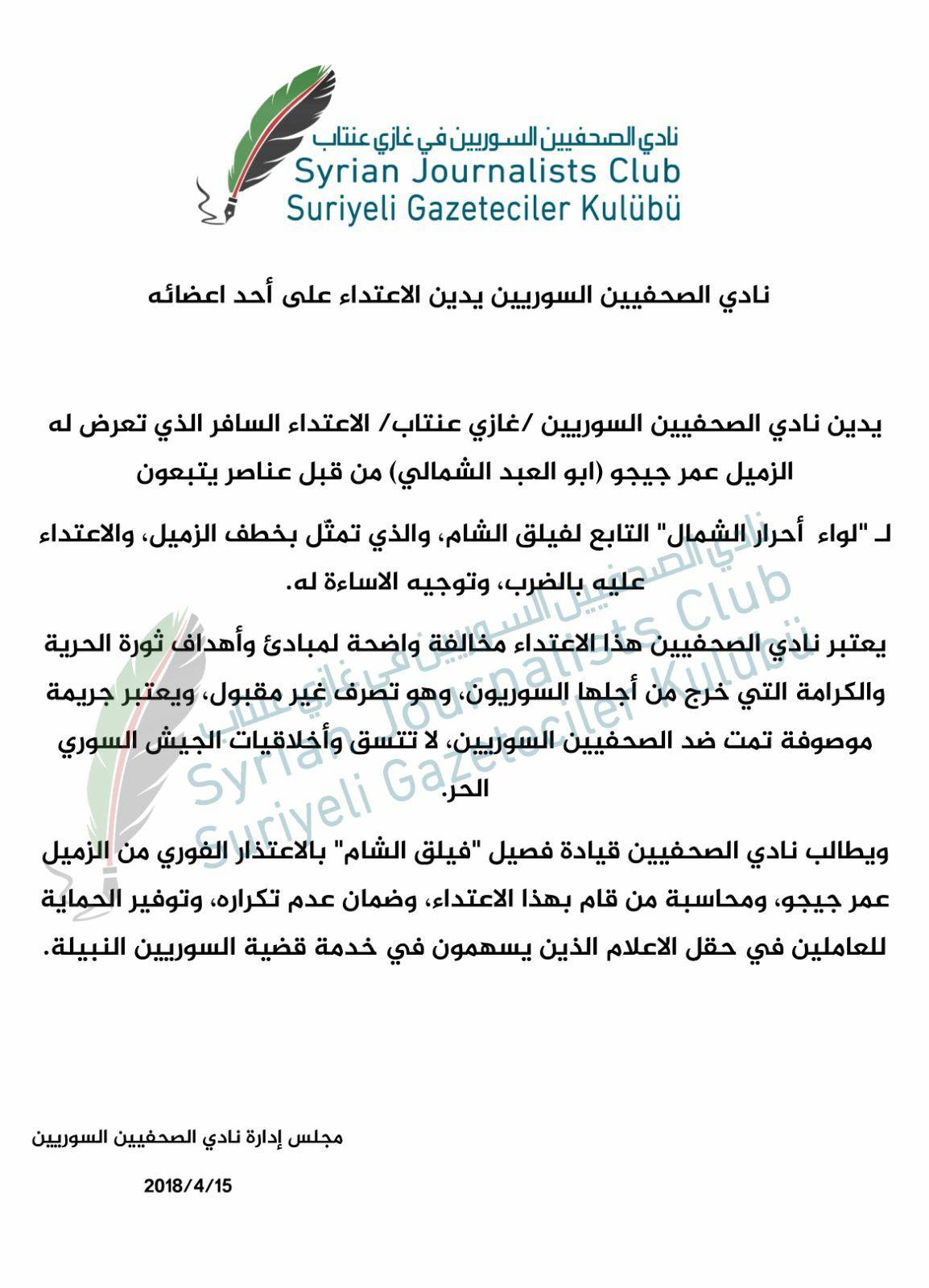 بيان من نادي الصحفيين السوريين يدين فيه الإعتداء على أحد أعضائه عمر جيجيو من قبل عناصر لواء أحرار الشمال