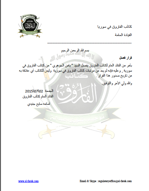 قرار فصل يامن الجوهري من كتائب الفاروق