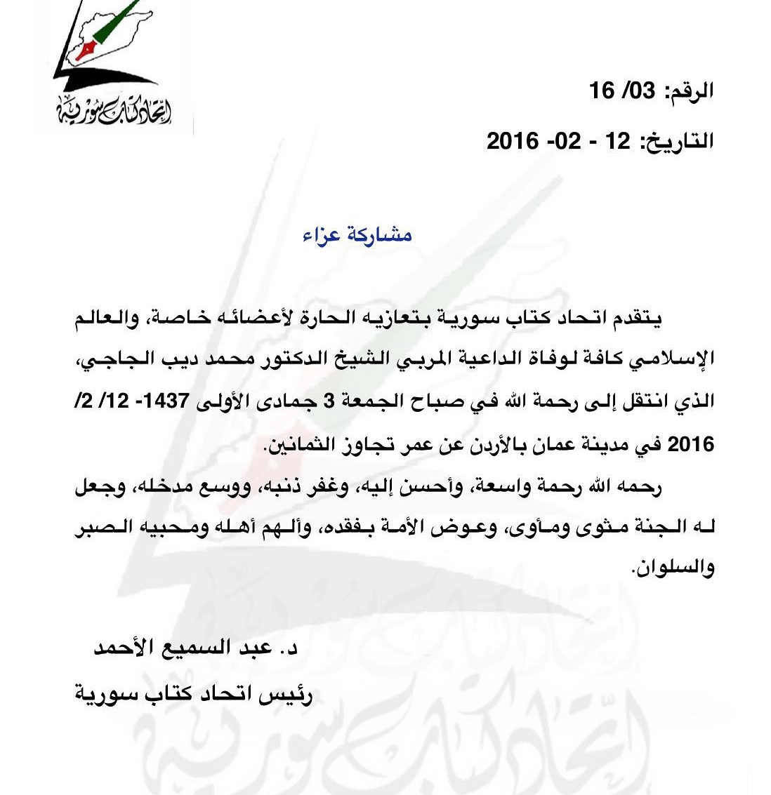 تعزية اتحاد كتاب سورية الأحرار بوفاة الشيخ محمد ديب الجاجي