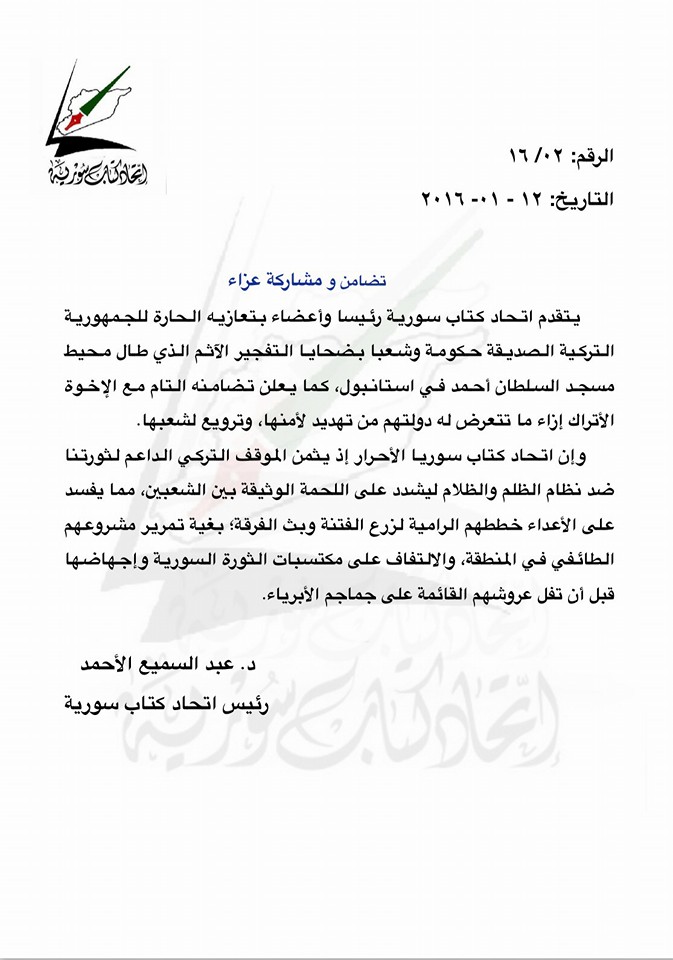 تعزية اتحاد كتاب سورية الأحرار الحكومة التركية بضحايا تفجير مسجد السلطان أحمد في اسطنبول