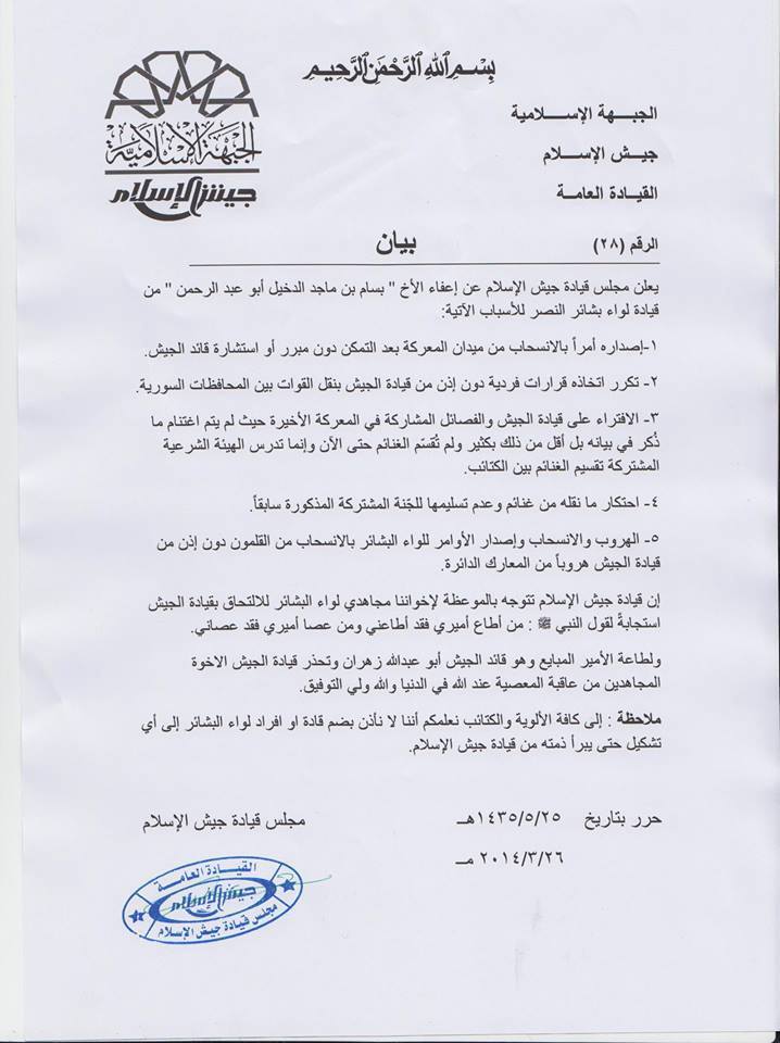 إعلان "الجبهة الإسلامية" إعفاء بسام الدخيل من قيادة "لواء بشائر النصر"