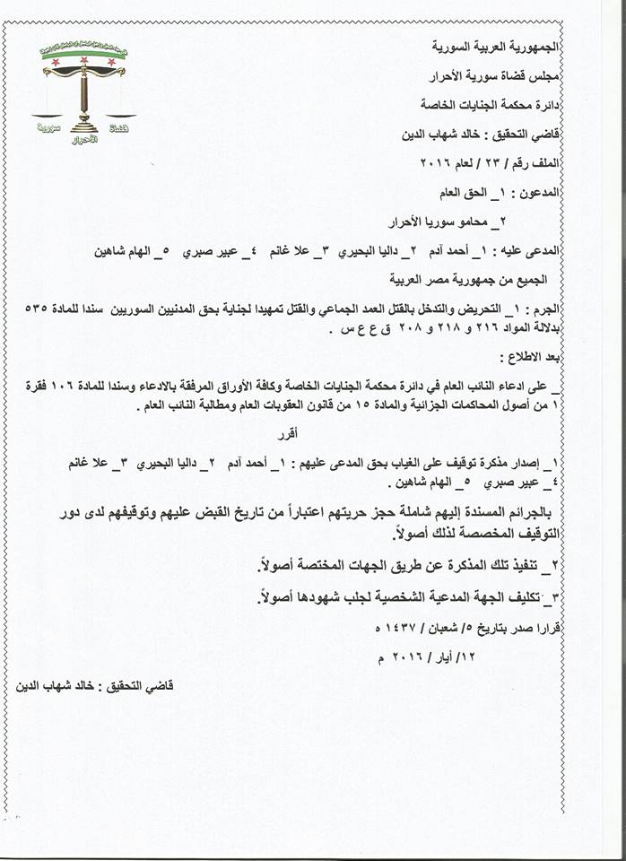 قرار "مجلس قضاة سورية الأحرار" إصدار مذكرة توقيف بحق ممثلين مصريين