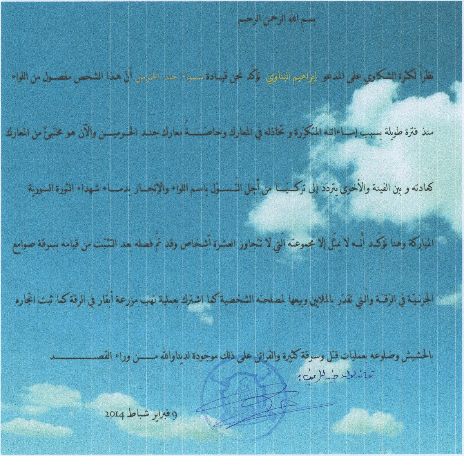بيان "لواء جند الحرمين"حول فصل إبراهيم البناوي لتغيبه عن المعارك