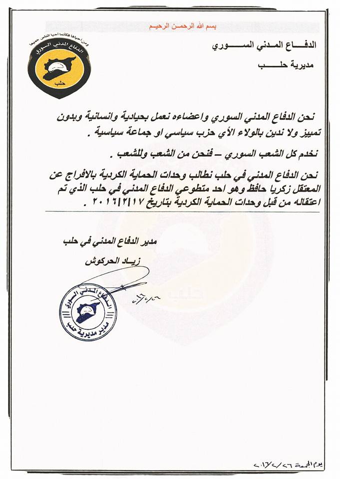 نطالب وحدات الحماية الكردية بالافراج عن العنصر زكريا حافظ وهو احدى متطوعي الدفاع المدني والتي تم اعتقاله من قبل وحدات الحماية الكردية بتاريخ 17/2/2016بي