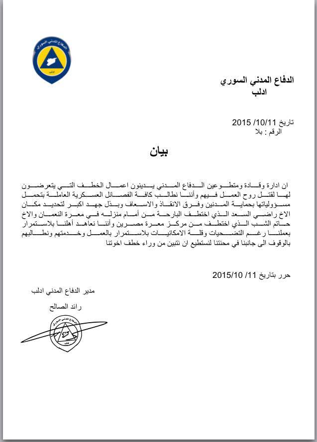 إن إدارة وقادة ومتطوعوين الدفاع المدني يدينون أعمال الخطف التي يتعرضون لها لقتل روح العمل فيهم وأننا نطالب كافة الفصائل العسكرية العاملة بتحمل مسؤولياتها بحماية المدنيين وفرق الإنقاذ والإسعاف وبذل جهد أكبر لتحديد مكان الأخ راضي السعد الذي اختطف البارحة من أمام منزله في معرة النعمان والأخ حاتم الشب الذي اختطف من مركز معرة مصرين وأننا نعاهد أهلنا بلإستمرار بعملنا رغم التضحيات وقلة الإمكانيات بلإستمرار بالعمل وخدمتهم ونطالبهم بالوقوف الى جانبنا في محنتنا لنستطيع أن نتبين من وراء خطف اخوتنا