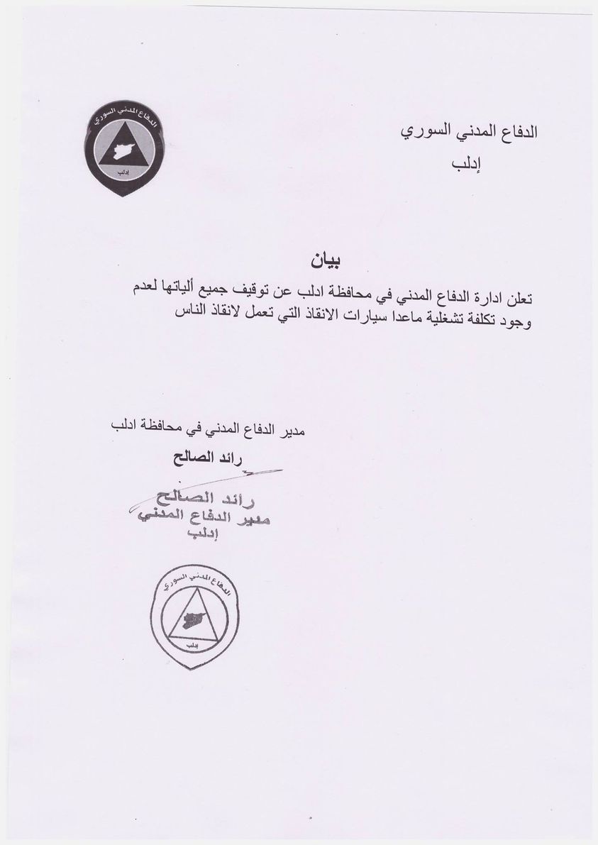 بيان تعلن ادارة الدفاع المدني في محافظة ادلب عن توقيف جميع ألياتها لعدم وجود تكلفة تشغلية ماعدا سيارات الانقاذ التي تعمل لانقاذ الناس