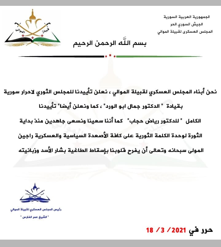 بيان من المجلس العسكري لقبيلة الموالي يعلن فيه تأييده للمجلس الثوري لأحرار سورية