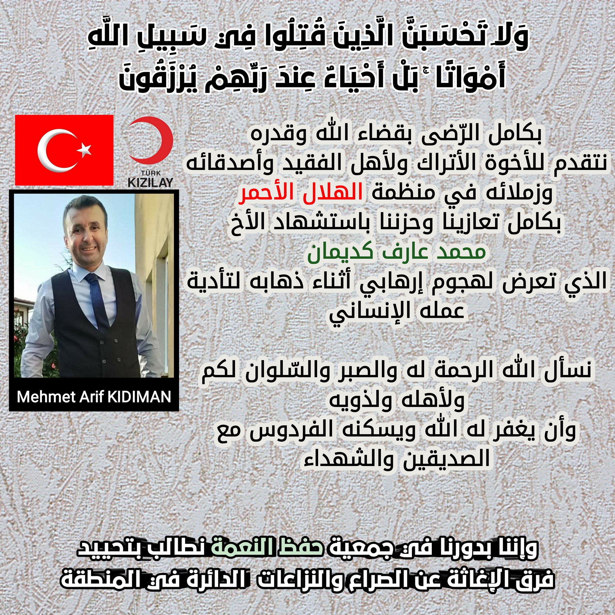 بيان من جمعية حفظ النعمة والعطاء تعزي فيه الهلال الأحمر التركي بمحمد عارف كديمان الذي تعرض لهجوم إرهابي