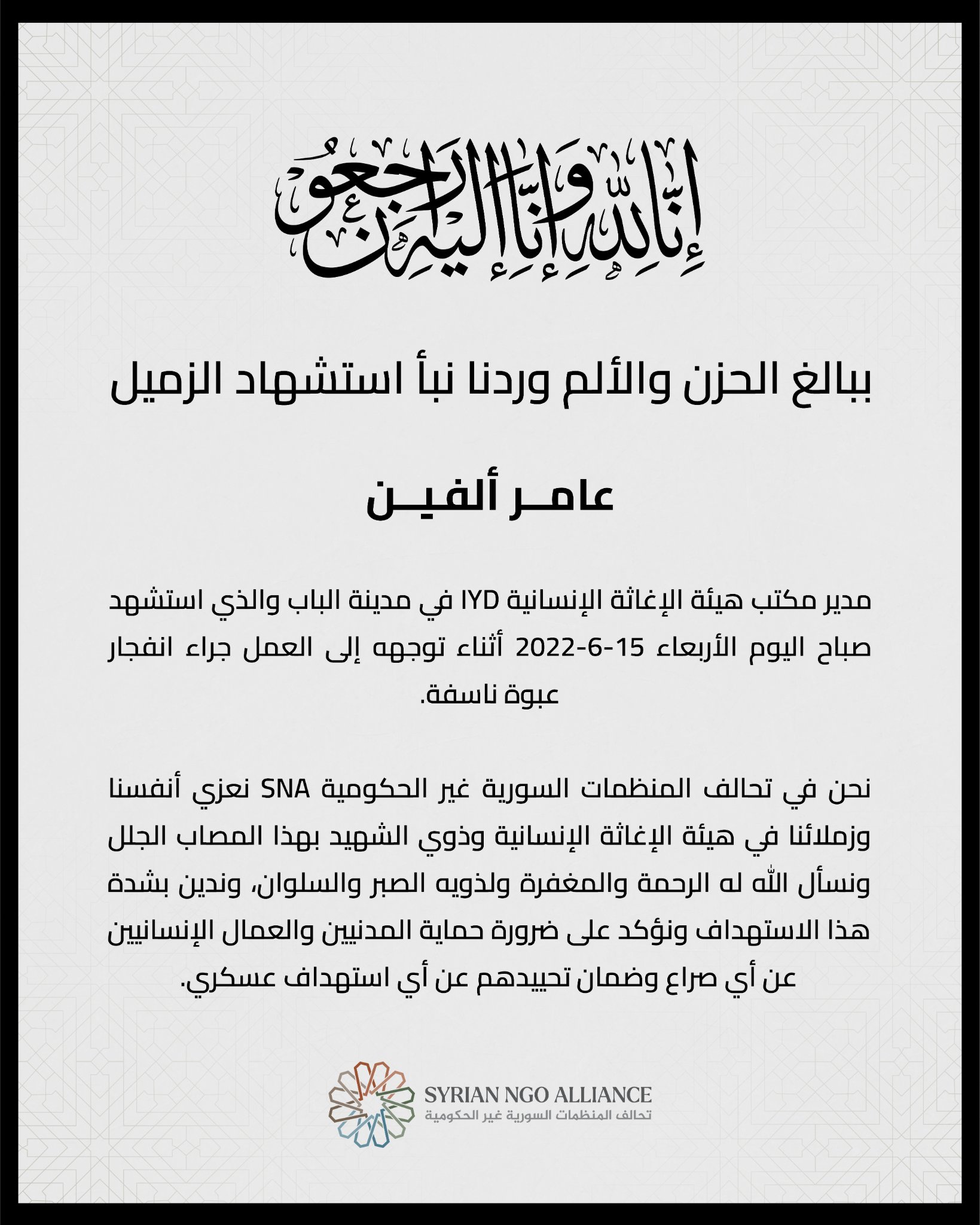 بيان من تحالف المنظمات السورية غير الحكومية يعزي فيه بعامر ألفين مدير مكتب هيئة الإغاثة الإنسانية