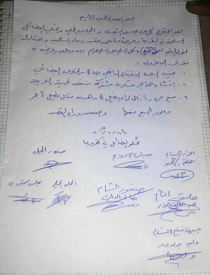 بعد اجتماع كل من مجلس الشورى والمجلس المحلي وممثلي الفصائل المسلحة في القرية وحرصاً منا على حقن دماء المسلمين وامتثالاً لقول النبي (صلى الله عليه وسلم) "كل المسلم على المسلم حرام دمه وماله وعرضه" فقد قرر الحاضرون: