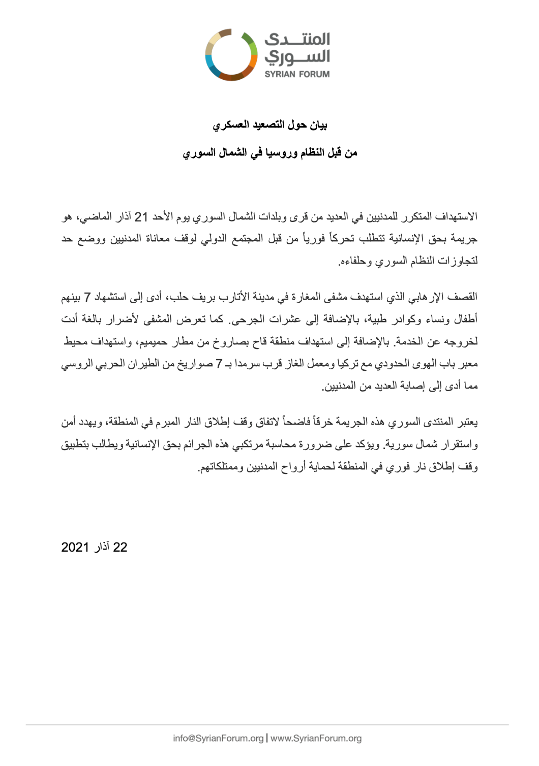 بيان المنتدى السوري حول التصعيد العسكريمن قبل النظام وروسيا في الشمال السوري