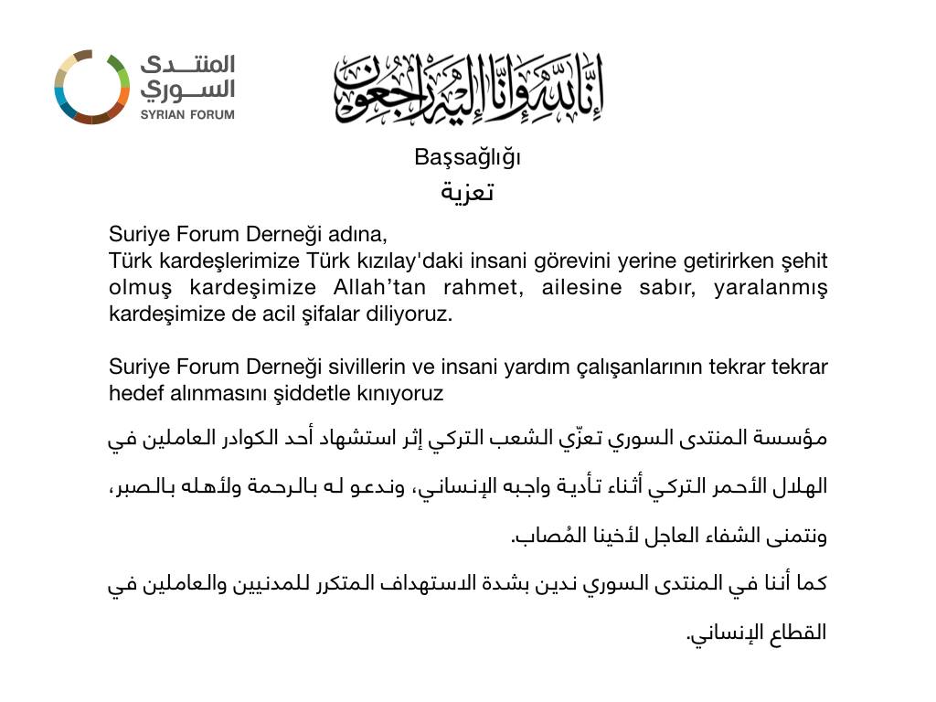 بيان من المنتدى السوري يعزي فيه الشعب التركي بأحد كوادر الهلال الأحمر التركي