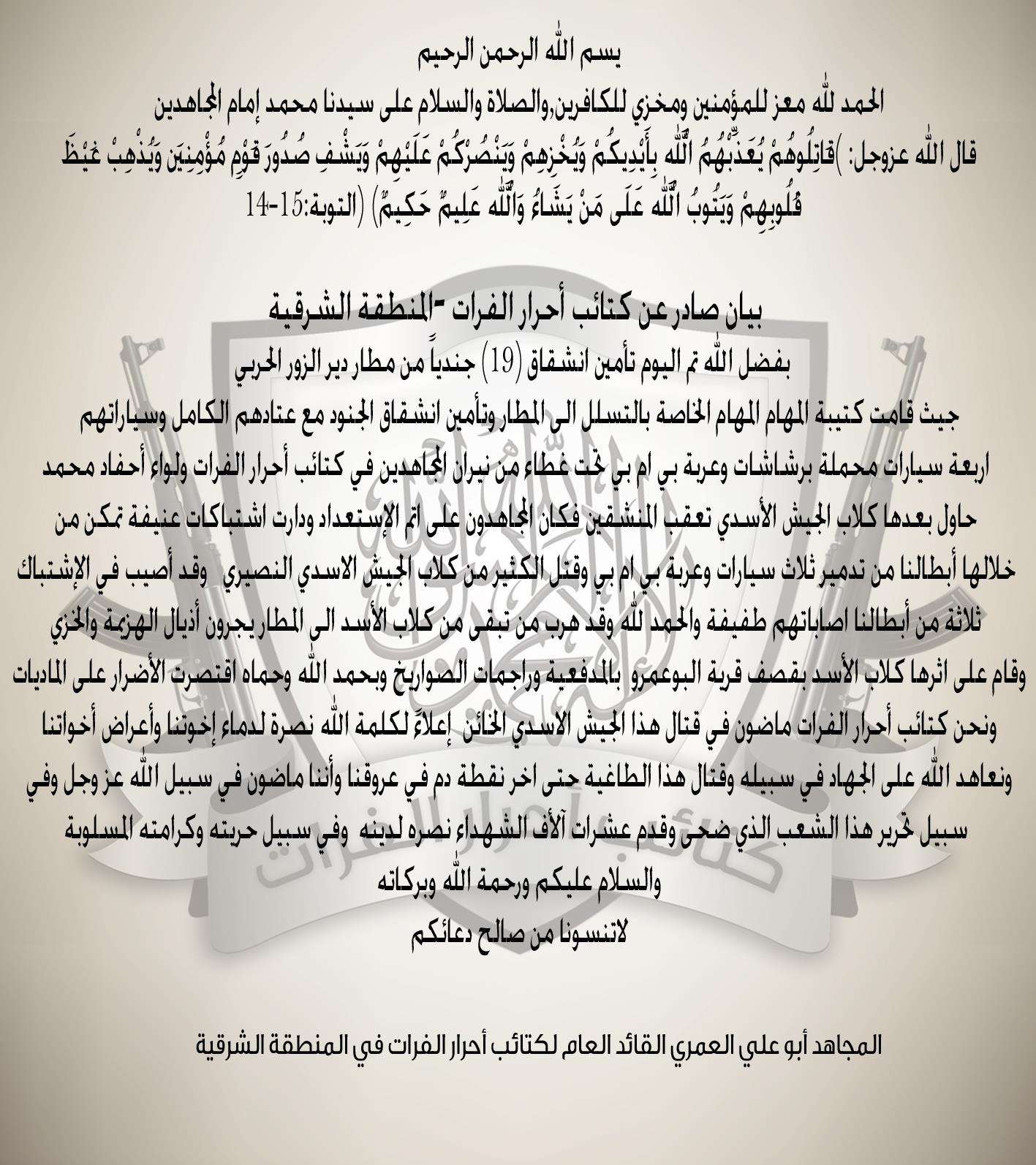 بيان تأمين انشقاق 19 جندي من مطار دير الزور من قبل كتائب أحرار الفرات