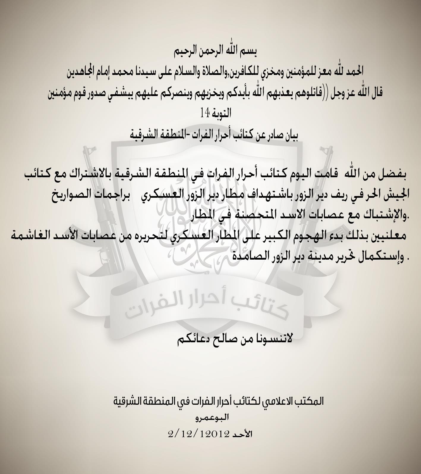 كتائب أحرار الفرات تعلن بدء معركة السيطرة على مطار دير الزور