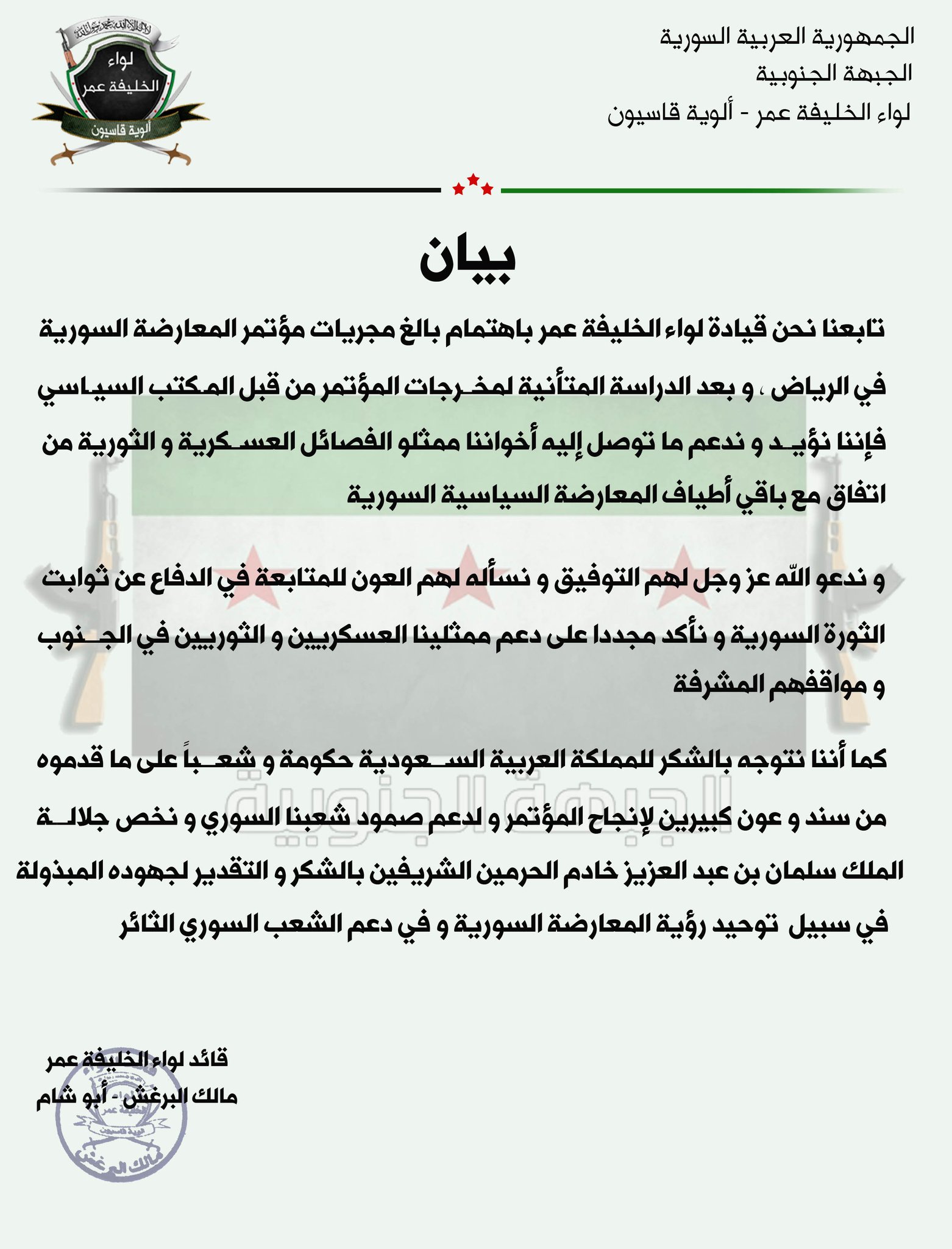 بيان من لواء الخليفة عمر يؤكد فيه دعمه قرارات مؤتمر الرياض