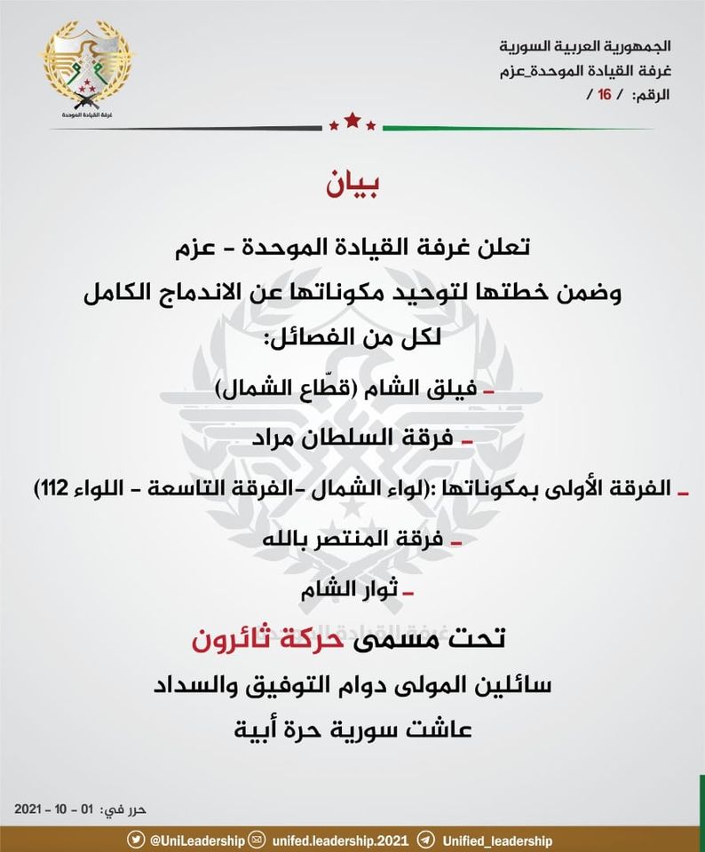 بيان تشكيل حركة ثائرون التابعة للجيش الوطني