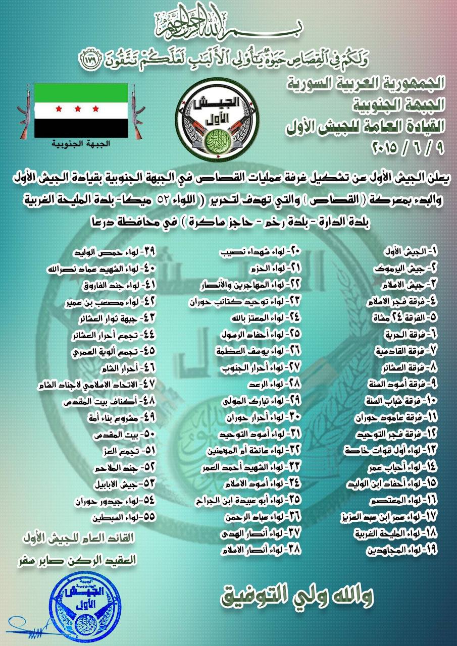 لواء السبطينلواء جيدور حورانجيش الأبابيل - قطاع جنوب دمشقجند الملاحم في درعا لواء جند الملاحم - درعاجماعة بيت المقدس - درعامشروع بناء أمةكتائب أكناف بيت المقدس - قطاع دمشق وريفهاالاتحاد الإسلامي لأجناد الشام - قطاع الغوطة الشرقية حركة أحرار الشام الإسلامية - قطاع جنوب سورياتجمع ألوية العمريتجمع أحرار العشائرجيش ثوار العشائركتيبة مصعب بن عمير - درعاتجمع جند الفاروقلواء الشهيد عماد نصر اللهلواء حمص الوليد - درعالواء أنصار الإسلام - ريف دمشقجماعة أنصار الهدى في درعالواء عباد الرحمن - جنوب دمشقلواء أبو عبيدة بن الجراح - درعالواء أسود الإسلام - إنخل/دمشقلواء الشهيد أحمد العمرلواء عائشة أم الؤمنين - جيش الإسلام - درعالواء أحرار حوران - دمشق/درعالواء أحرار الجنوبلواء يوسف العظمة - درعالواء أحفاد الرسول - درعالواء المعتز بالله - درعالواء توحيد كتائب حورانلواء المهاجرين والأنصار - درعالواء المجاهدين - درعالواء عمر بن عبد العزيز - درعالواء أحباب عمر في درعافرقة فجر التوحيدفرقة عمود حورانفرقة شباب السنة - درعافرقة أسود السنة - درعافرقة العشائر - درعافرقة القادسيةفرقة الحرية - درعاالفرقة 24 مشاةفرقة فجر الإسلام - درعاجيش الإسلام - قطاع درعاجيش اليرموكالجيش الأوللواء معاذ بن جبل - درعا/القنيطرةكتيبة/لواء الرعد - الحراككتيبة/لواء شهداء نصيبكتائب/لواء المعتصم بالله - درعااللواء الأول مهام خاصة - فرقة فجر التوحيدلواء أحفاد خالد بن الوليد - درعاالمجموعات
