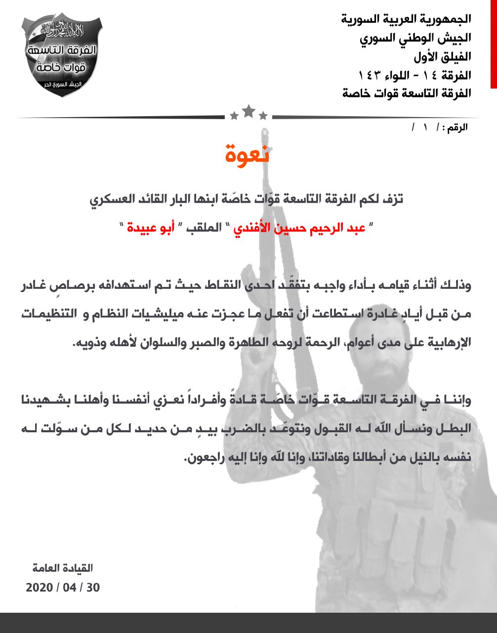 الفرقة التاسعة قوات خاصة تنعي القيادي عبد الرحيم الأفندي