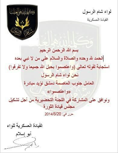 بيان انضمام لواء شام الرسول إلى مبادرة واعتصموا