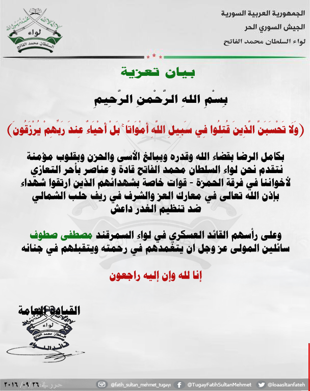 بيان تعزية من لواء السلطان محمد الفاتح بمصطفى صطوف القائد العسكري في لواء السمرقند