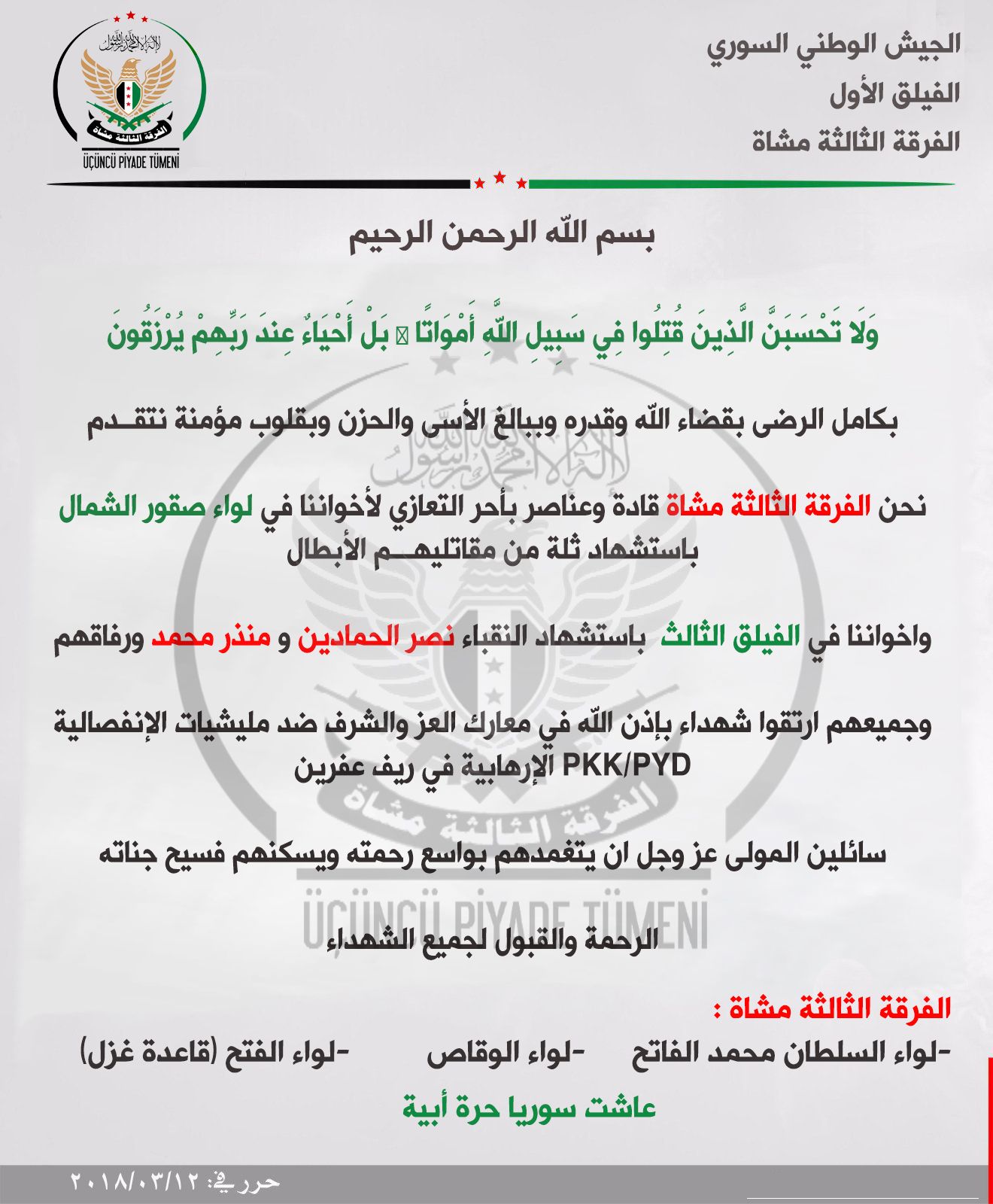 بيان تعزية من الفرقة الثالثة مشاة بعدد من ضباط الفيلق الثالث