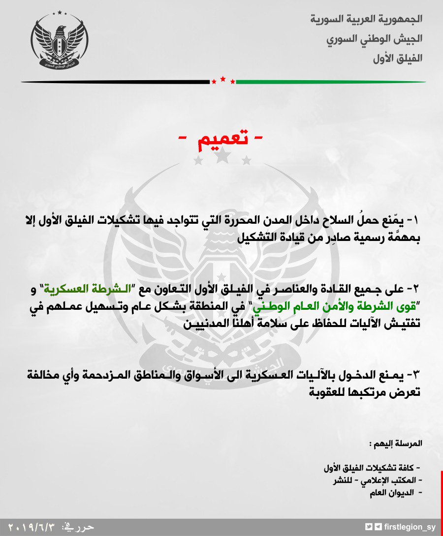 قرار من الفيلق الأول بمنع عناصره من حمل السلاح في المدن وضرورة تسهيل عمل الشرطة العسكرية
