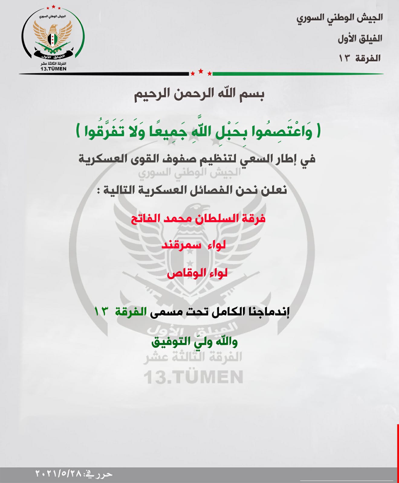 بيان تشكيل الفرقة 13 التابعة للجيش الوطني