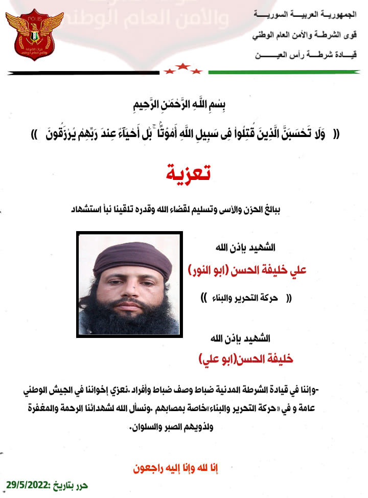بيان من قوات الشرطة والامن العام في مدينة رأس العين تعزي فيه حركة التحرير والبناء باثنين من عناصرها