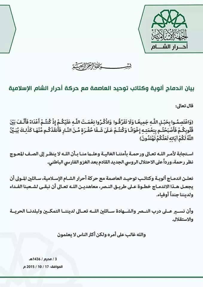 بيانبيان اندماج ألوية وكتائب توحيد العاصمة مع حركة أحرار الشام الإسلامية