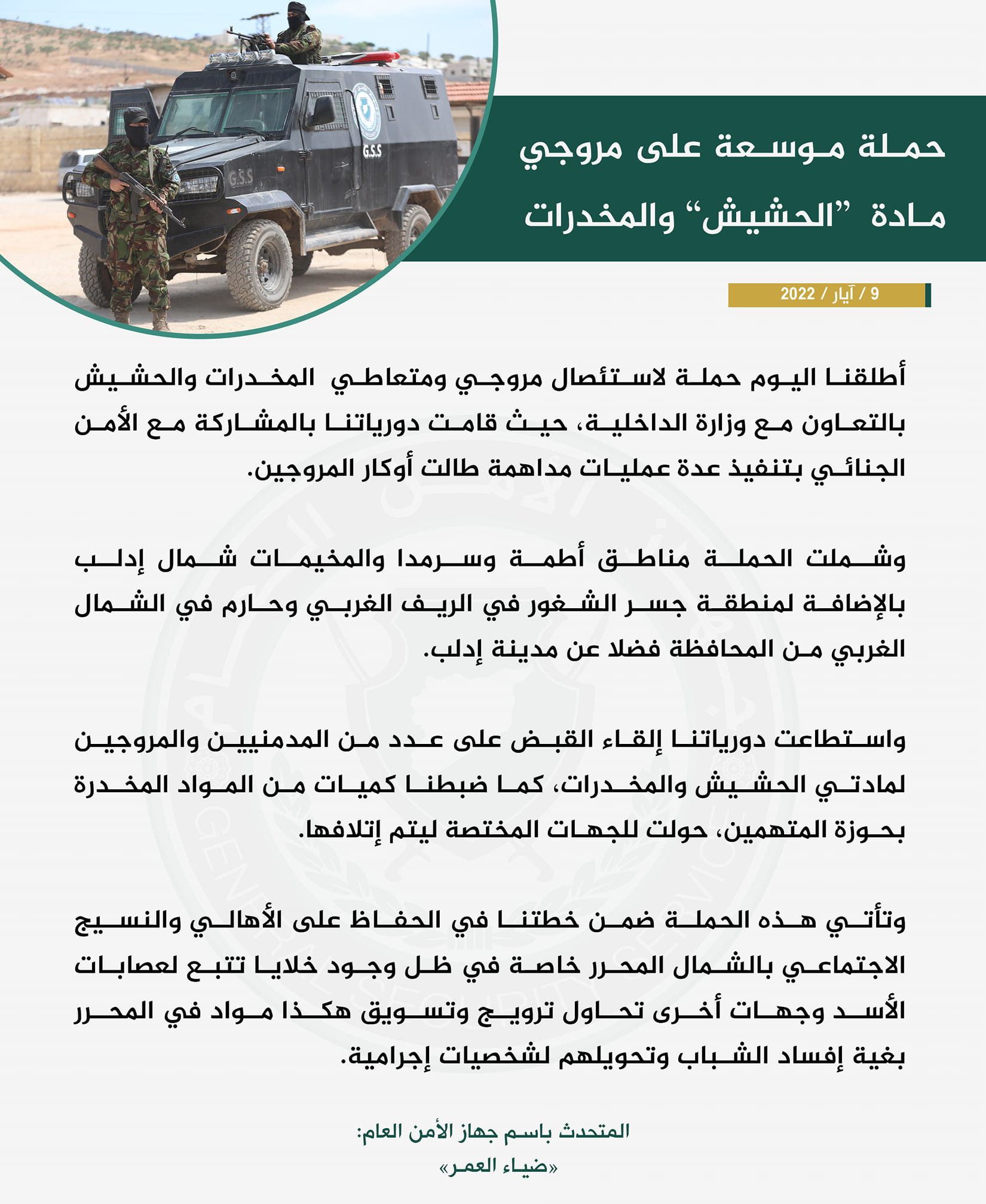 بيان من جهاز الأمن العام حول إطلاقه حملة لاستئصال مروجي ومتعاطي المخدرات والحشيش بالتعاون مع وزارة الداخلية