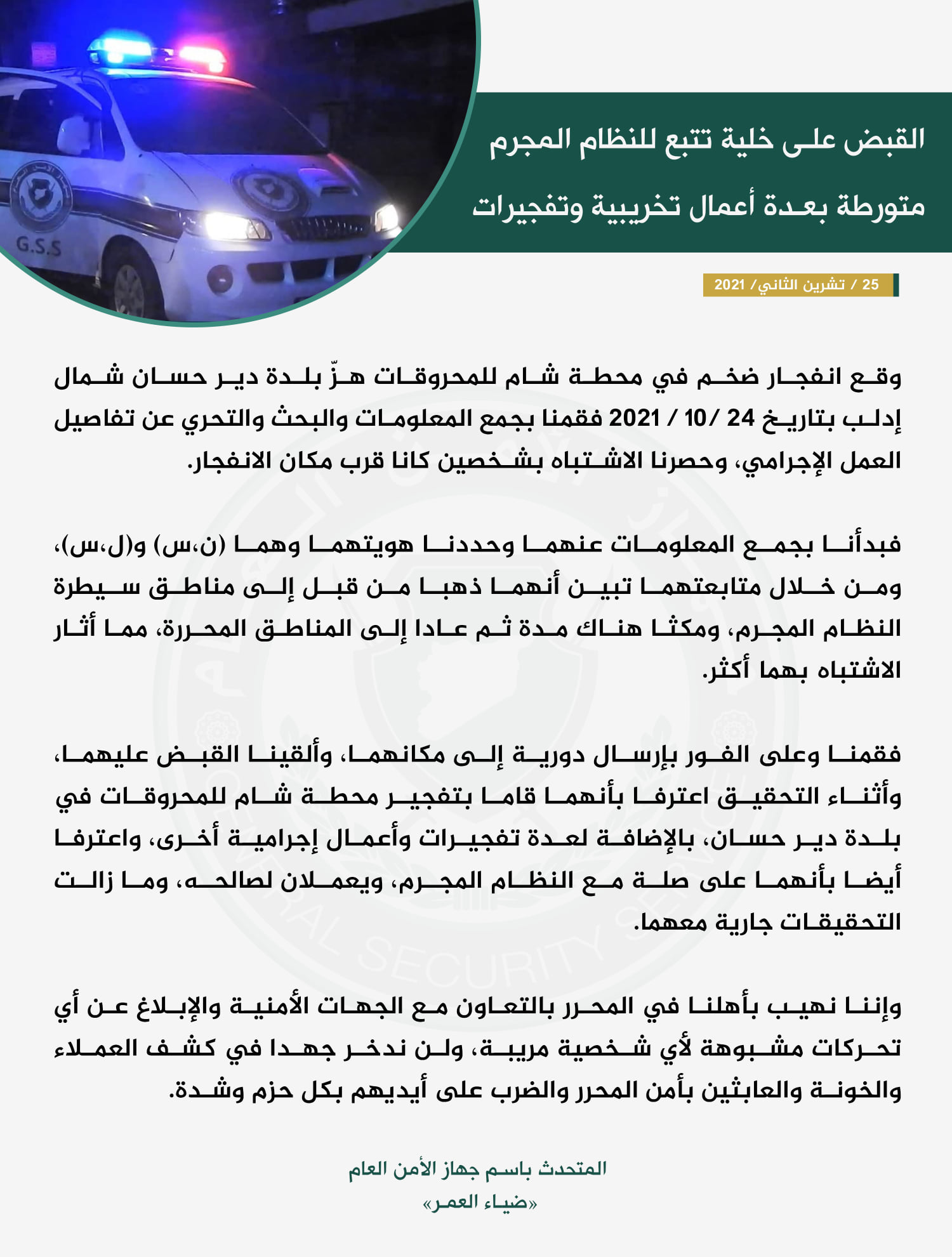 بيان من جهاز الأمن العام بشأن القبض على خلية تتبع للنظام المجرم متورطة بعدة أعمال تخريبية وتفجيرات