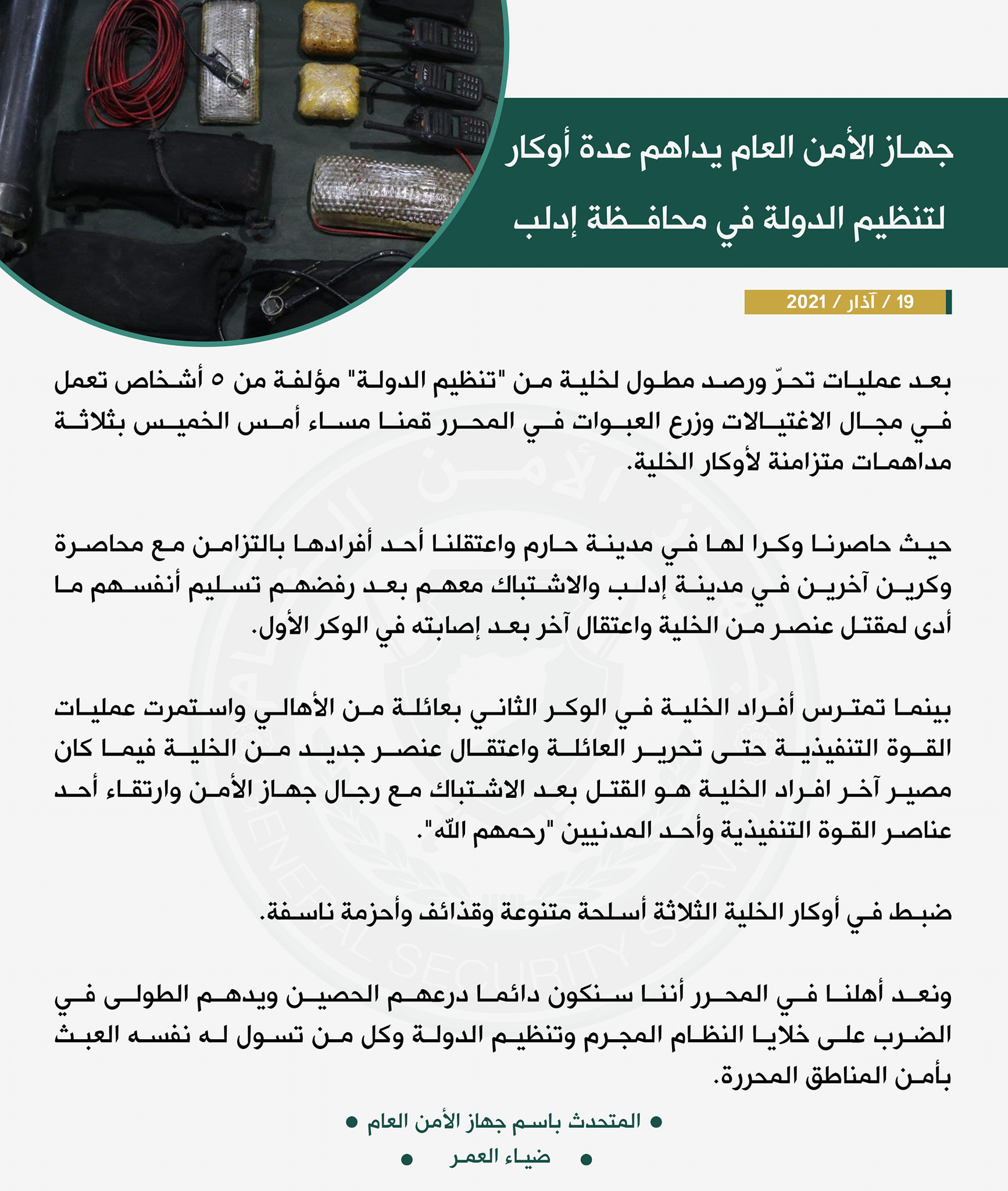 بيان من جهاز الأمن العام حول مداهمته عدة أوكار لـ"تنظيم الدولة" في محافظة إدلب