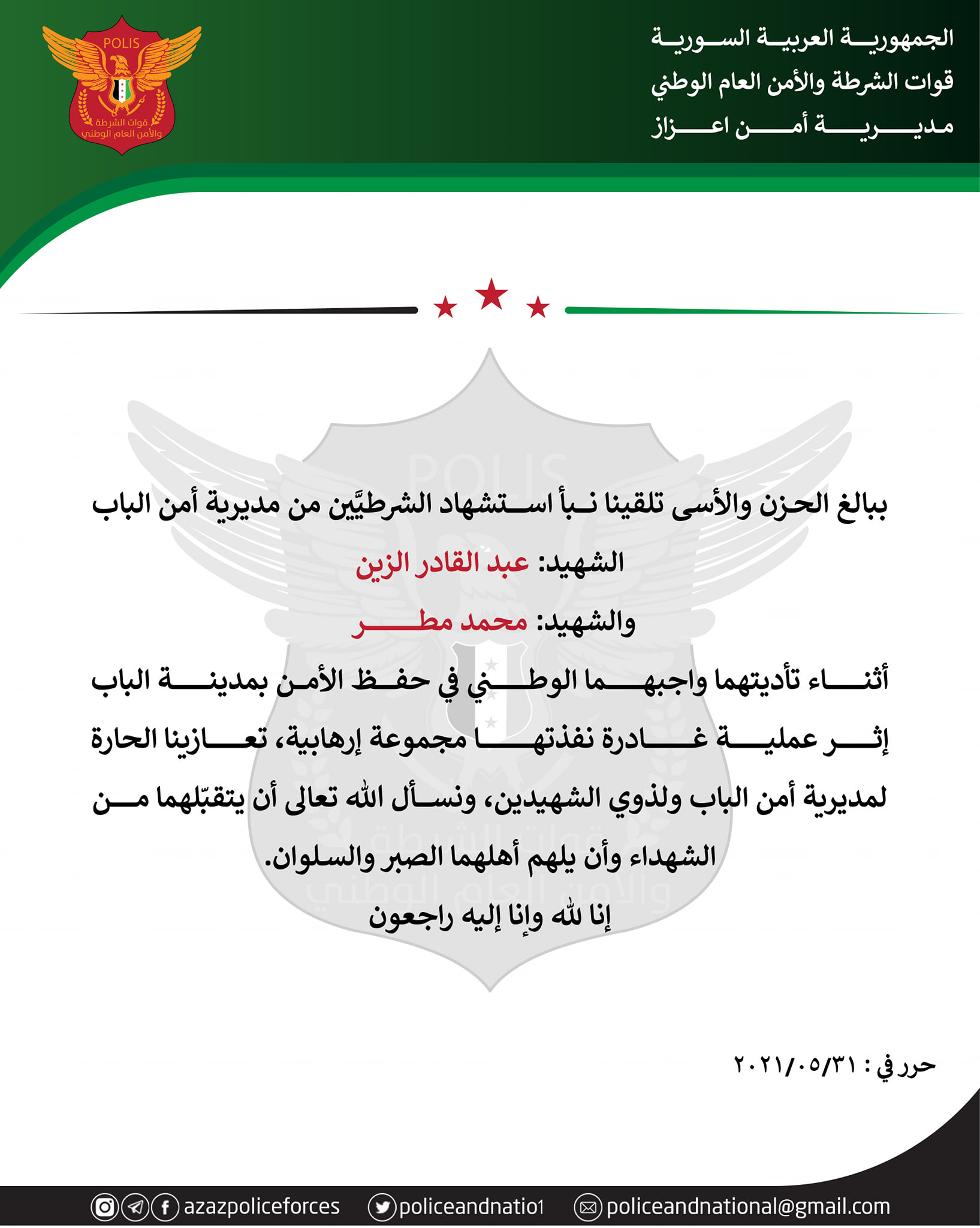 بيان من قوات الشرطة والأمن العام الوطني في اعزاز تعزي فيه مديرية أمن الباب باثنين من عناصرها