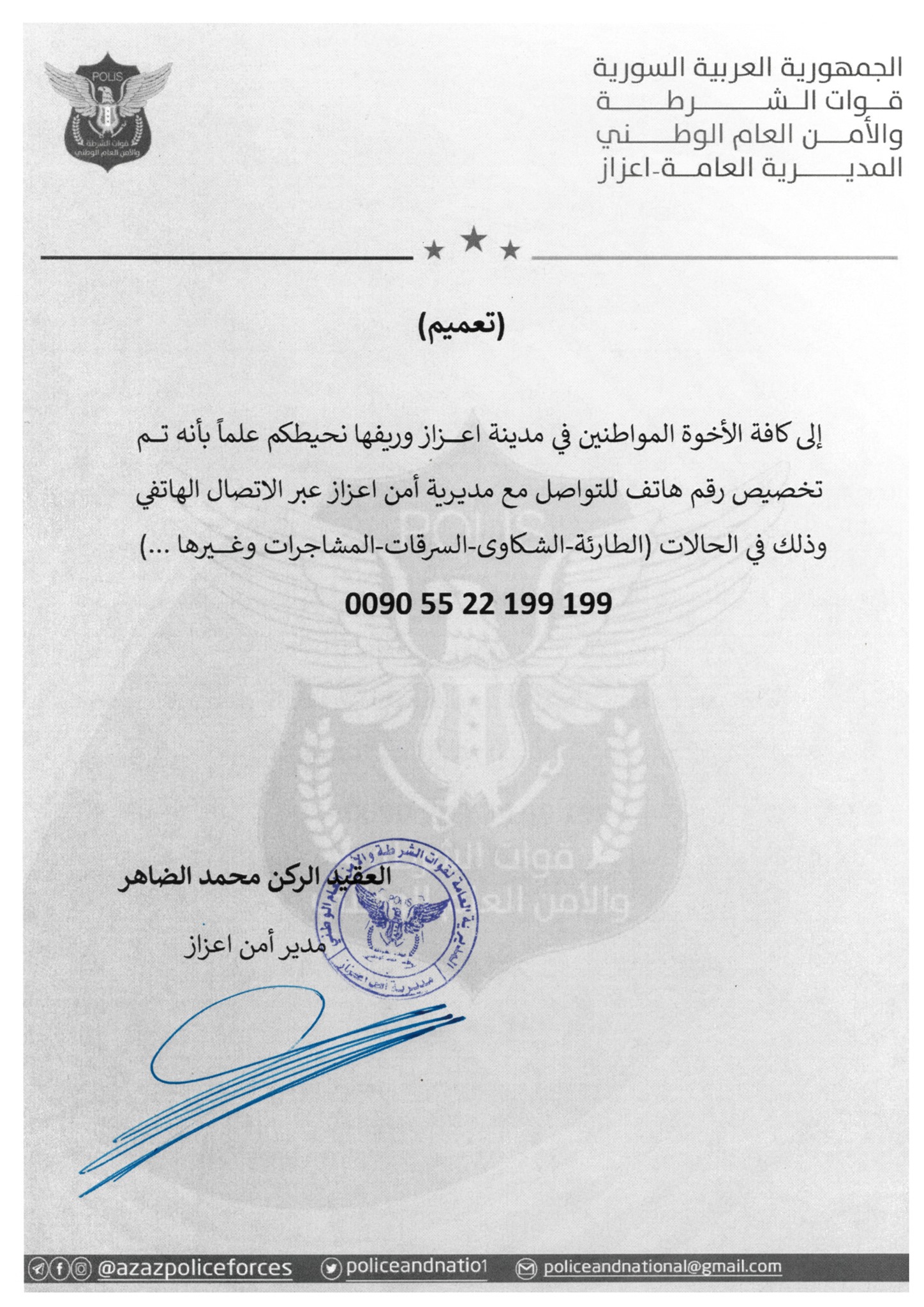 تعميم من قوات الشرطة والأمن العام الوطني في اعزاز بخصوص تخصيص رقم للطوارئ