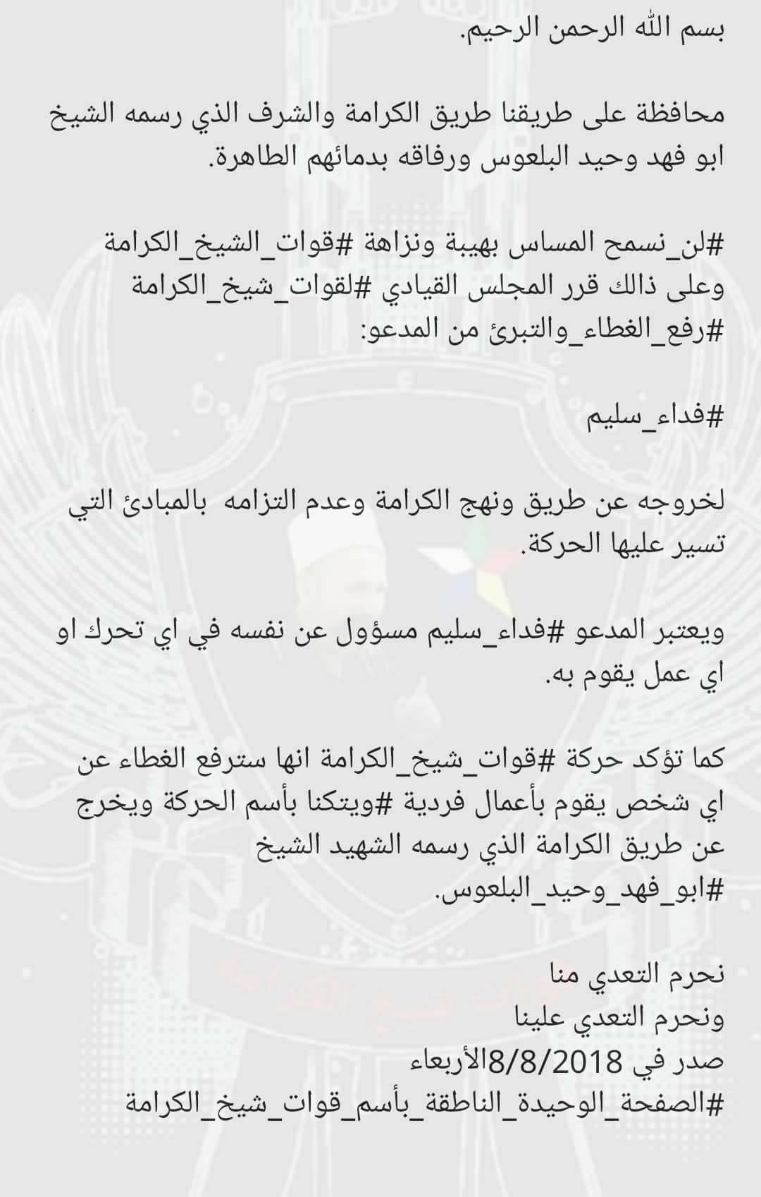 #لن_نسمح بل مساس بهيبة ونزاهة #قوات_الشيخ_الكرامة وعلى ذالك قرر المجلس القيادي #لقوات_شيخ_الكرامة ب #رفع_الغطاء_والتبري من المدعو: