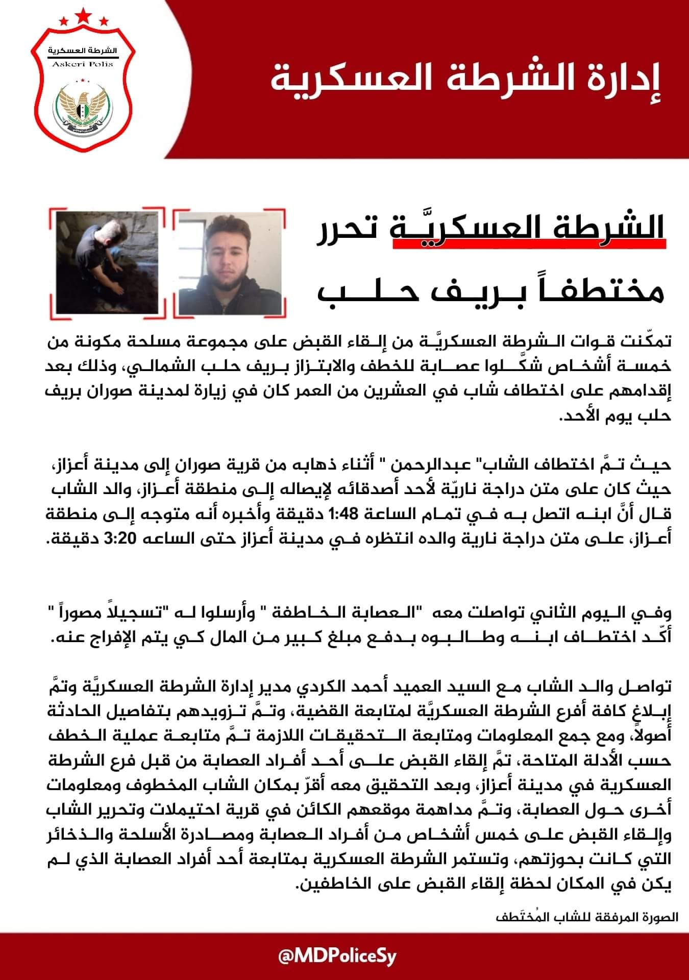بيان من فرع الشرطة العسكرية في مدينة الباب حول تحرير مختطف لدى عصابة مسلحة