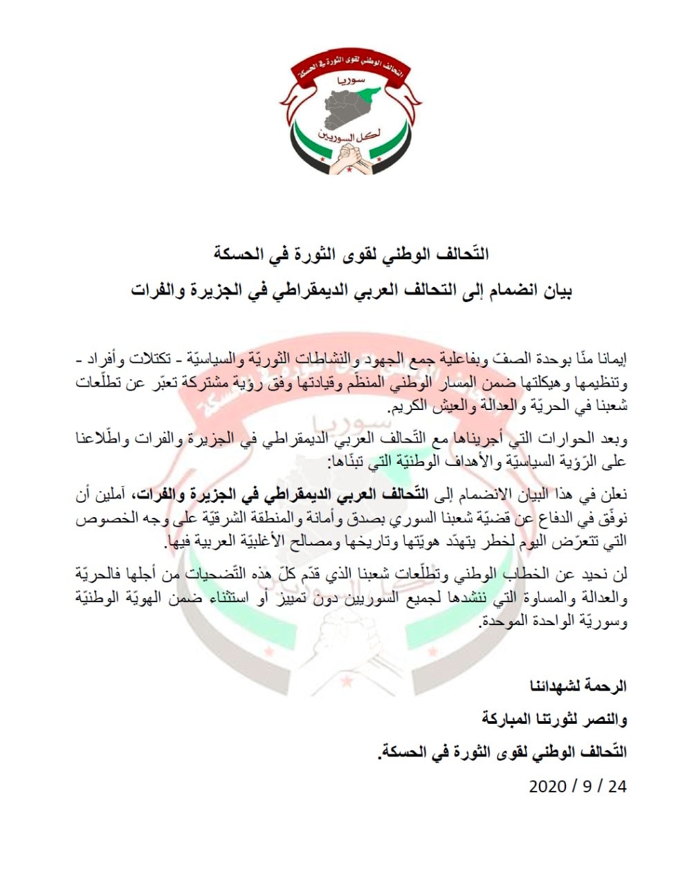 نعلن في هذا البيان الانضمام إلى التّحالف العربي الديمقراطي في الجزيرة والفرات، آملين أن نوفّق في الدفاع عن قضيّة شعبنا السوري بصدق وأمانة والمنطقة الشرقيّة على وجه الخصوص التي تتعرّض اليوم لخطر يتهدّد هويّتها وتاريخها ومصالح الأغلبيّة العربية فيها.