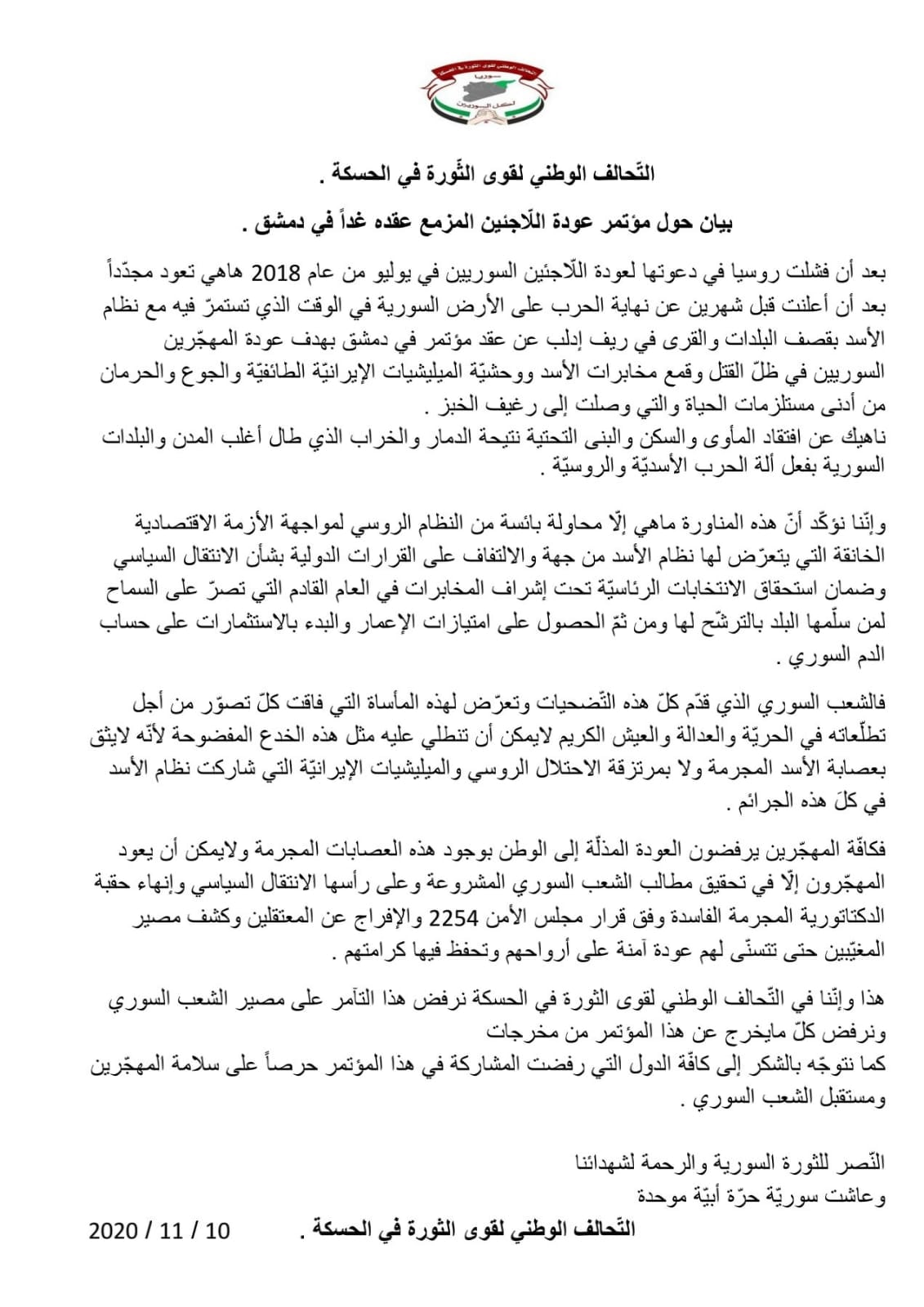 بيان التحالف الوطني لقوى الثورة في الحسكة حول مؤتمر عودة اللاجئين في دمشق