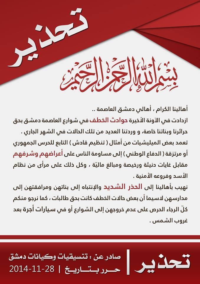 تحذير من تنسيقيات وكيانات دمشق بخصوص عمليات الخطف التي تجري في العاصمة