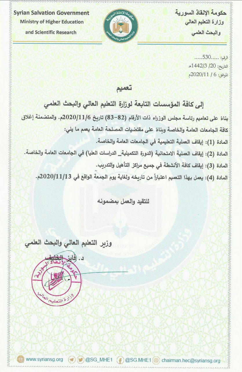 تعميم حكومة الإنقاذ السورية بإيقاف العملية التعليمية والامتحانية لمدة بسبب وباء كورونا