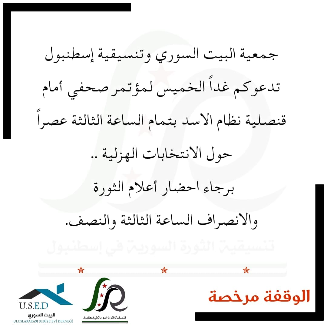 جمعية البيت السوري وتنسيقية استنبول تدعوكم غدا الخميس لمؤتمر صحفي امام قنصلية نظام الاسد بتمام الساعة الثالثة عصر حول الانتخابات الهزلية ..
