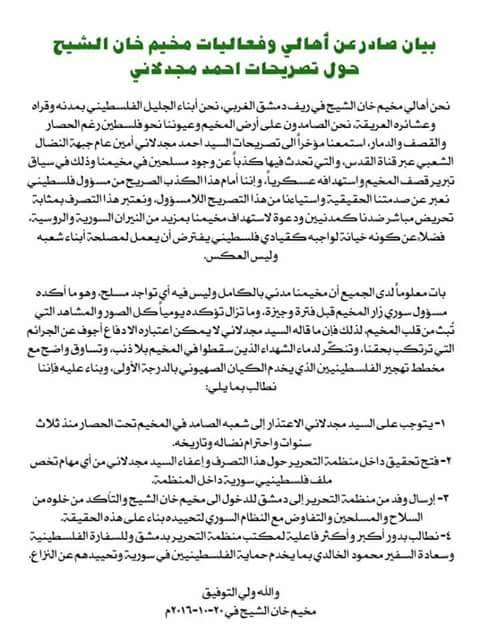 بيان صادر عن أهالي مخيم خان الشيح للاجئيين الفلسطينيين بريف دمشق ينفي وجود مسلحين في المخيم