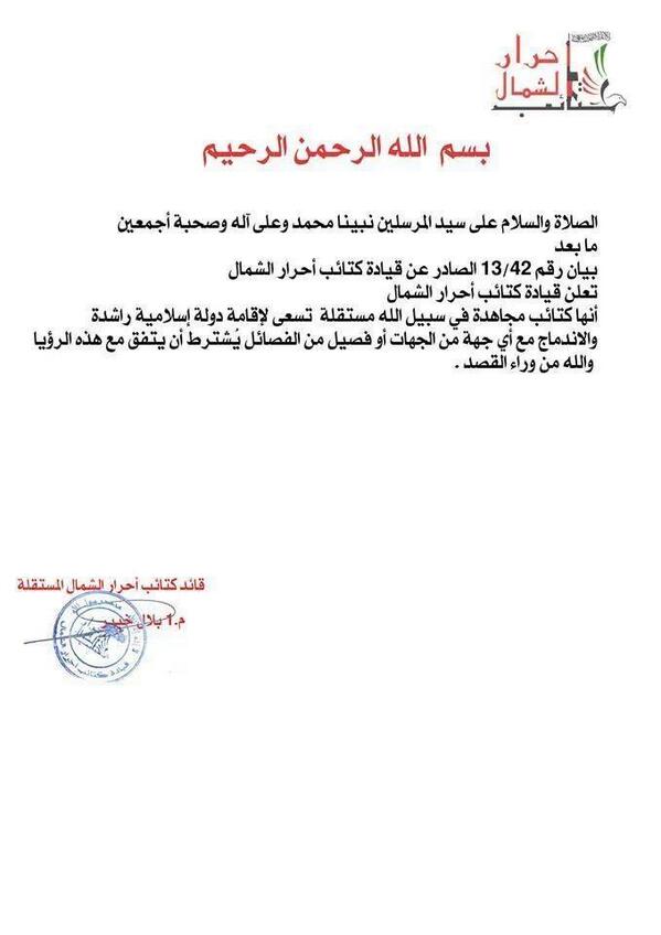 بيان من كتائب أحرار الشمال تؤكد فيه كونها كتائب مجاهدة مستقلة تسعى لإقامة دولة إسلامية راشدة