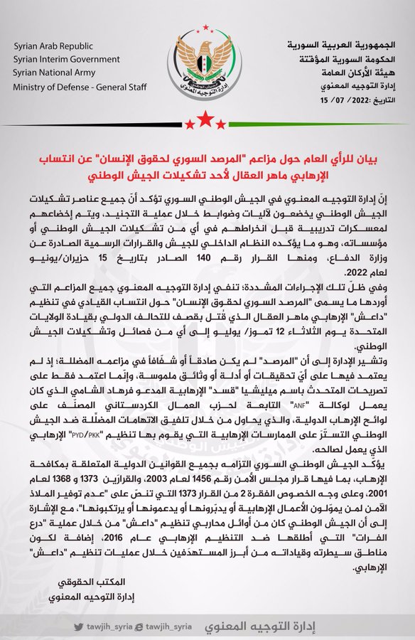 بيان من إدارة التوجيه المعنوي في الجيش الوطني حول مزاعم المرصد السوري لحقوق الإنسان عن انتساب الإرهابي ماهر العقال لأحد فصائل الجيش الوطني